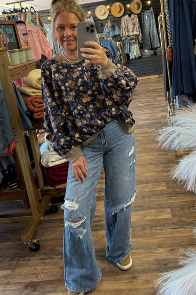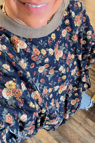 A polished twist on cozy—this oversized floral pullover blends a classic navy denim backdrop with autumn-hued blooms for that timeless, preppy feel. The structured ribbed trim and relaxed fit keep it chic yet comfortable, making it the perfect match for crisp denim or layered over collared shirts. Effortlessly refined with a hint of charm, it’s the floral favorite your wardrobe has been waiting for.